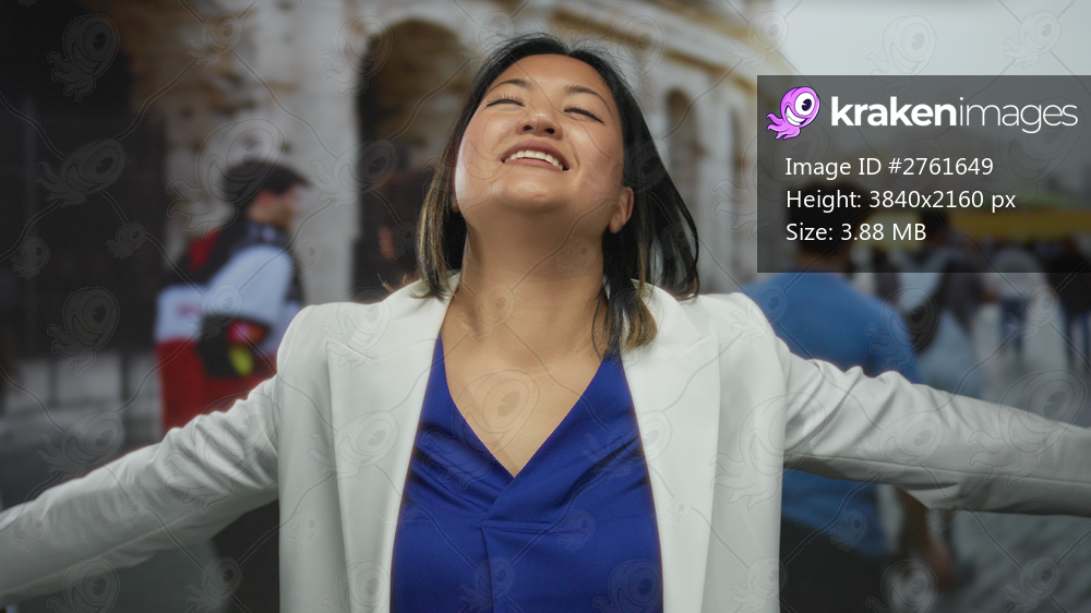 Woman with open arms smiling joyfully near the roman coliseum outdoors in rome city setting on a sunny day.