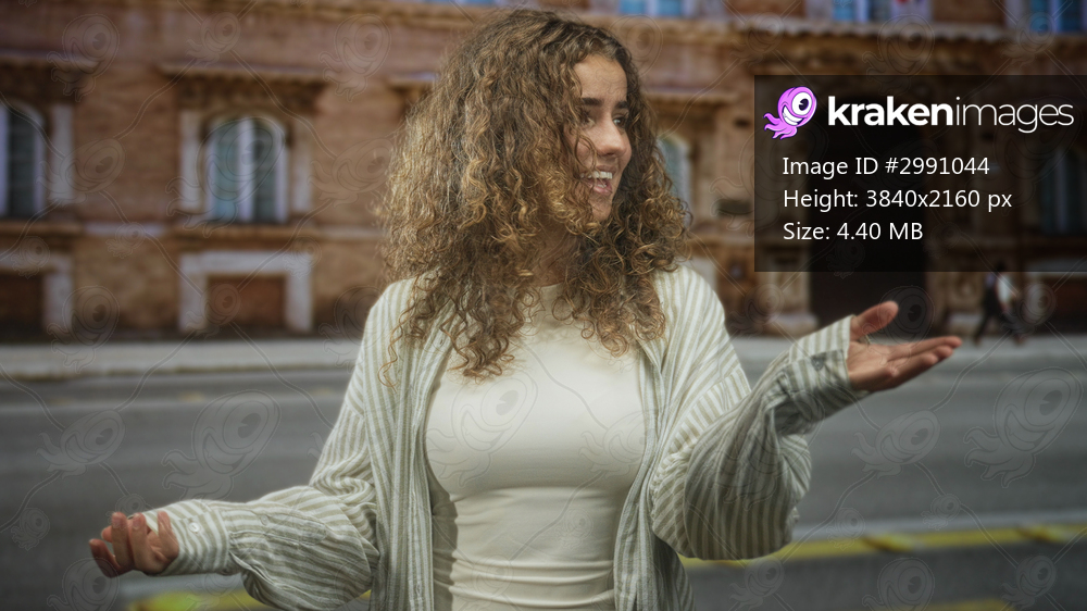 Woman with open hands shrugging on a city street in front of ornate brick building, expressive face showing uncertainty; confusion curiosity.