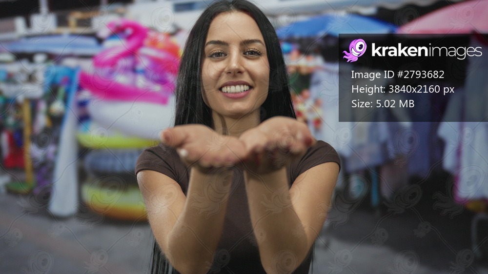 Woman with open hands smiling at outdoor market with colorful floats and clothing in background suggesting a vibrant city atmosphere during a sunny day - Kraken Images