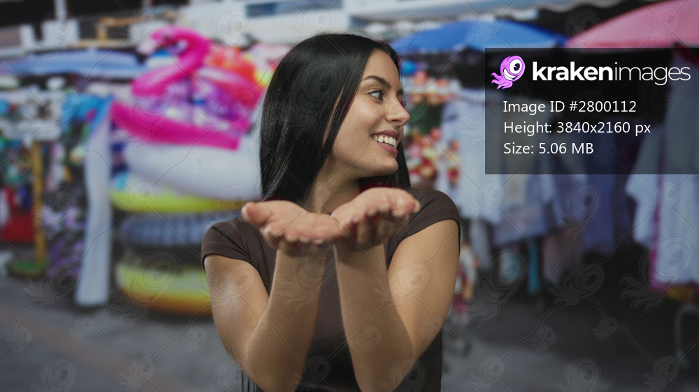 Woman with open hands smiling at outdoor market with colorful floats and clothing in background suggesting a vibrant city atmosphere during a sunny day - Kraken Images