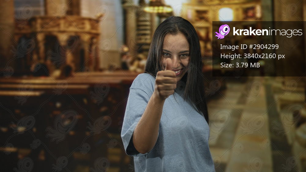 Woman with open hands and thumbs up gesture smiling inside a catholic church building among wooden pews; faith joy.