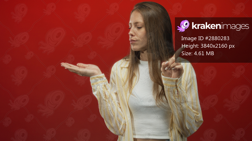 Woman with open left palm and raised right index finger wearing a white crop top and yellow striped shirt in red studio; doubt.