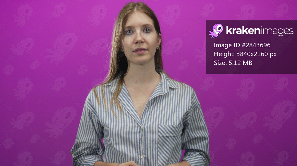 Woman with open mouth and clasped hands in studio wearing striped shirt shows blonde hair framing face; curiosity.