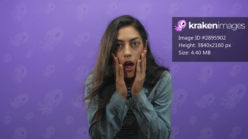 Woman with open mouth and hands near face in purple studio wearing denim jacket and striped shirt, leaning forward with hair blowing; surprise.