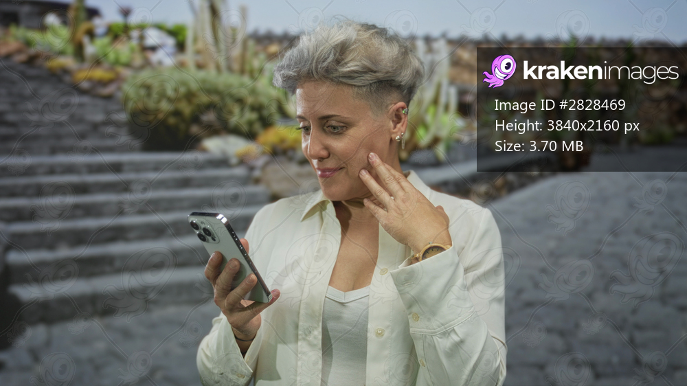 Woman with open mouth holds smartphone on street; surprise sharing reaction notification update alert message communication information news.