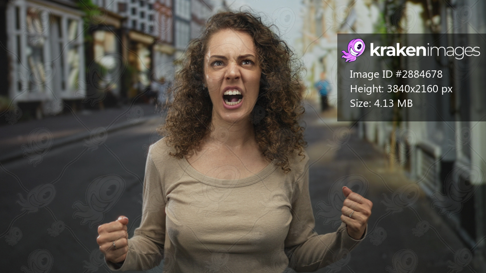 Woman with open mouth shouting on a city street, beige shirt visible and intense expression; anger outburst.