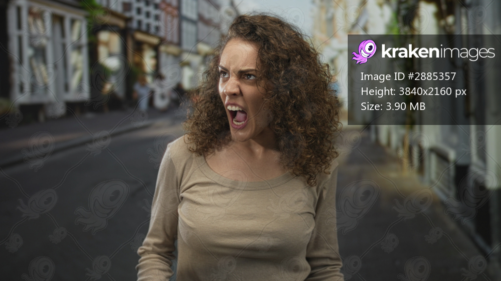 Woman with open mouth shouting on a city street, beige shirt visible and intense expression; anger outburst.