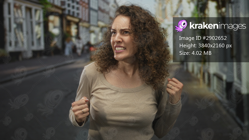 Woman with open mouth shouting on a city street, beige shirt visible and intense expression; anger outburst.