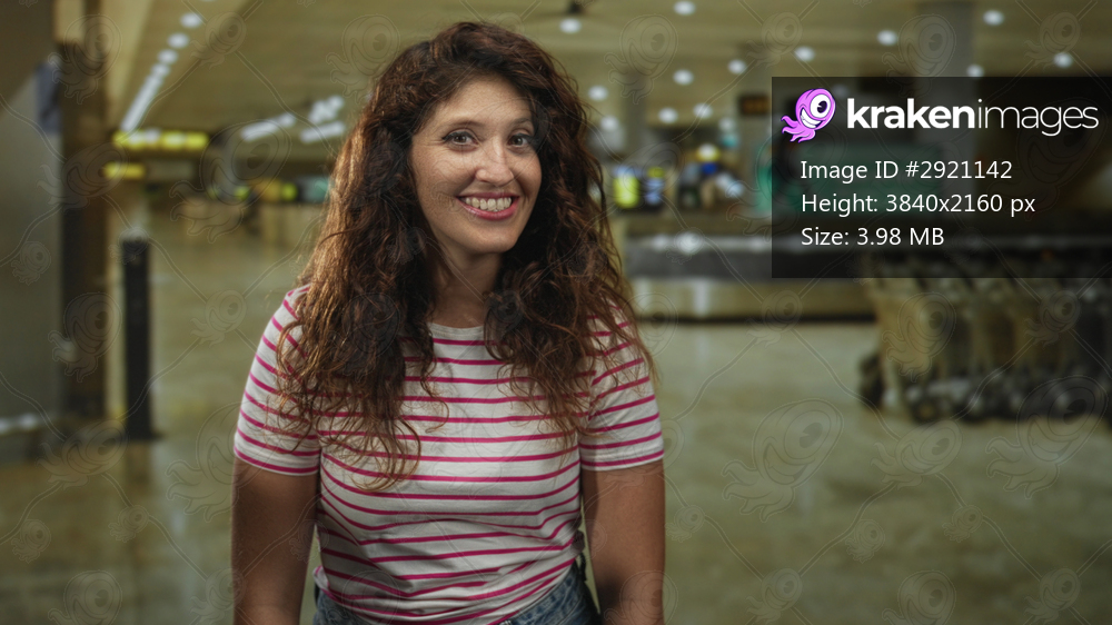 Woman with open mouth smiling, freckled face and bare forearms visible in busy airport terminal near baggage carousels and trolleys; arrival joy.