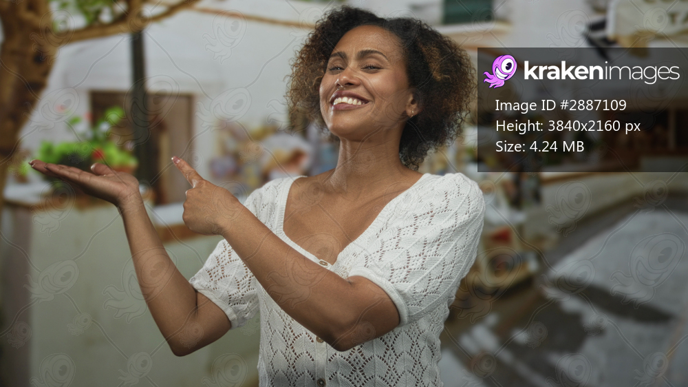 Woman with open palm and finger pointing to palm, smiling with closed eyes, standing in a lively street market; joy warm welcome.