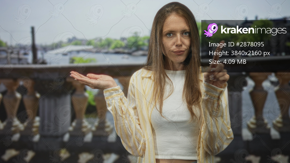 Woman with open palm and index finger raised in a warning gesture, standing on a canal street balcony in amsterdam beside stone balustrade wearing striped shirt and white crop top; playful caution. - Kraken Images
