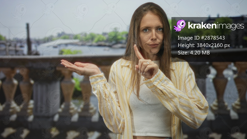 Woman with open palm and index finger raised in a warning gesture, standing on a canal street balcony in amsterdam beside stone balustrade wearing striped shirt and white crop top; playful caution. - Kraken Images