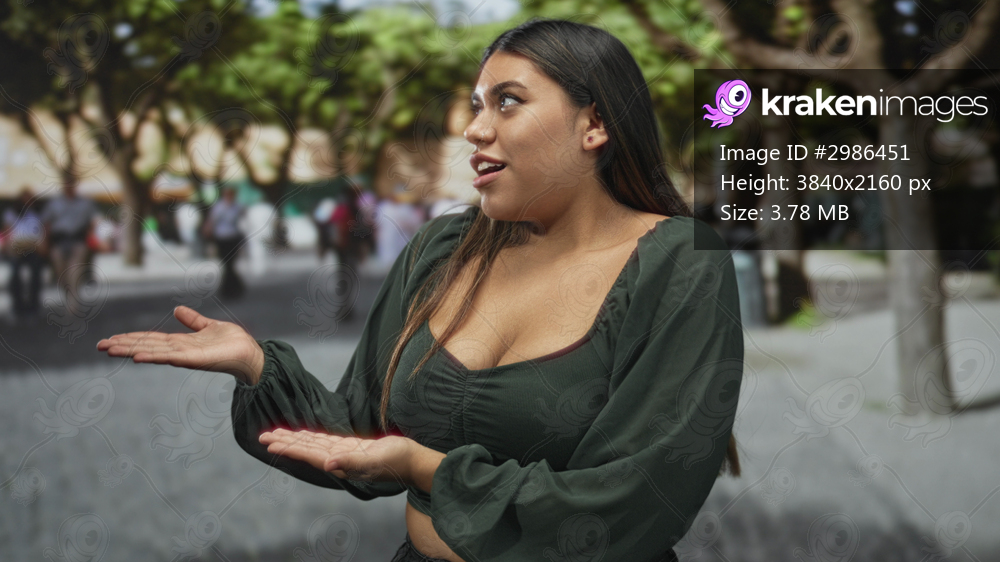 Woman with open palms gesturing conversationally and smiling, showing cleavage, on a tree lined street with pedestrians; playful invitation.