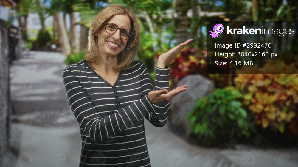 Woman with open palms presenting lush potted plants and garden path in studio, smiling and gesturing to foliage; welcoming.