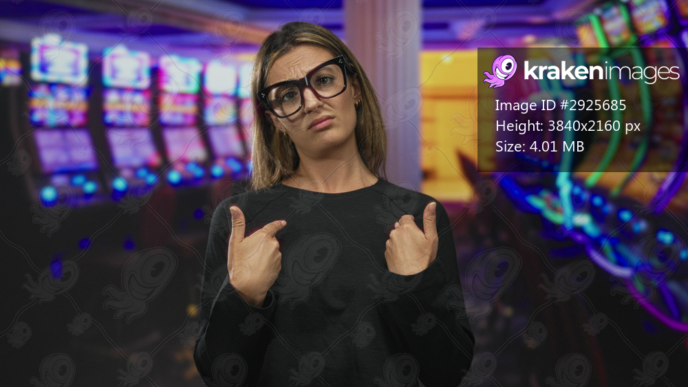 Woman with open palms raised by slot machines in casino building, wearing glasses and black top, looking upward; frustration.