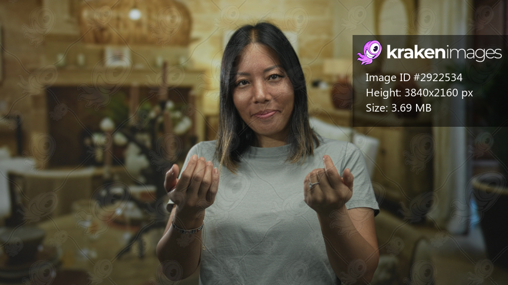 Woman with open palms reaching toward camera in a cozy living room interior with lamps and sofa and table settings; welcoming.