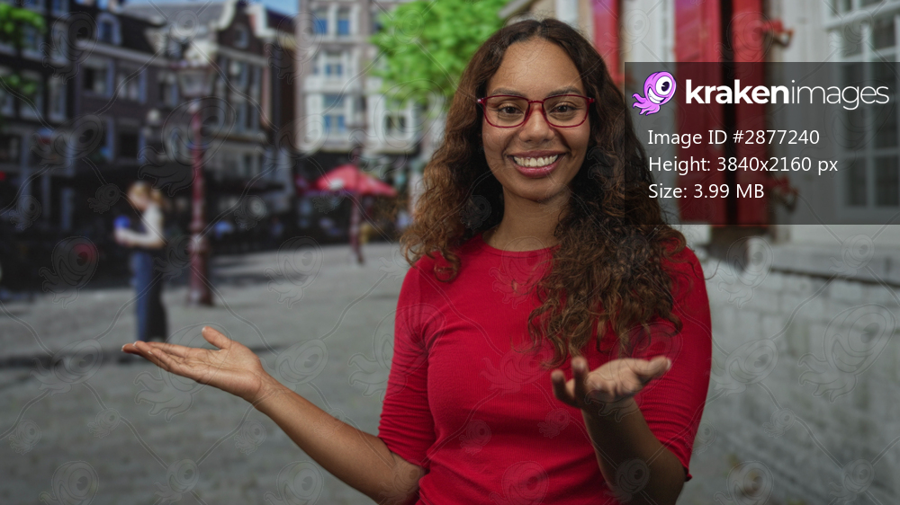 Woman with open palms and red glasses standing on a city street near cafes and buildings, presenting with outstretched hands; happy.