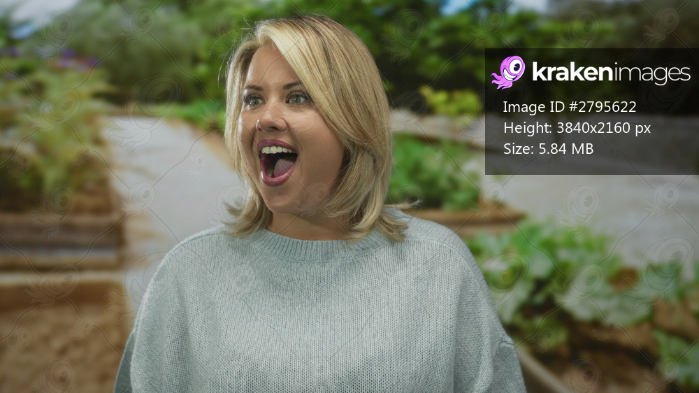 Woman opening mouth in forest amid green foliage while turning her head to one side with an astonished look; surprise.