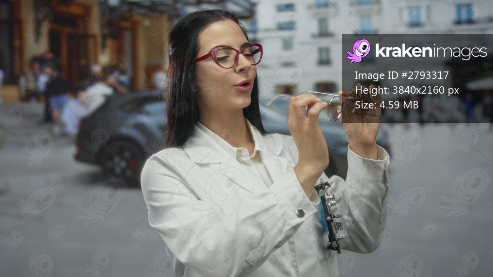 Woman optician adjusting glasses outdoors on a busy street showcasing eyewear while surrounded by blurred pedestrians and city life scene.