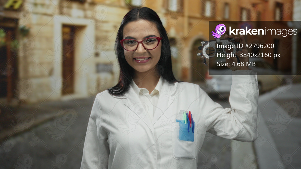 Woman optician with glasses in white uniform holds a trial frame outdoors on a street, showcasing a medical professional setting.