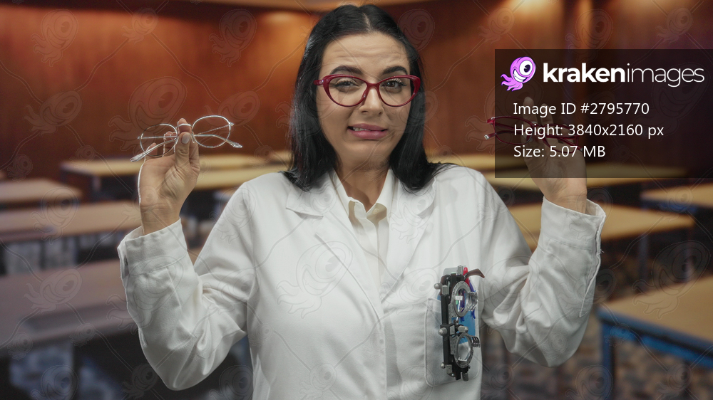 Woman optician in classroom holding glasses wearing uniform and glasses with confident expression indoor environment educational setting bright warm lighting