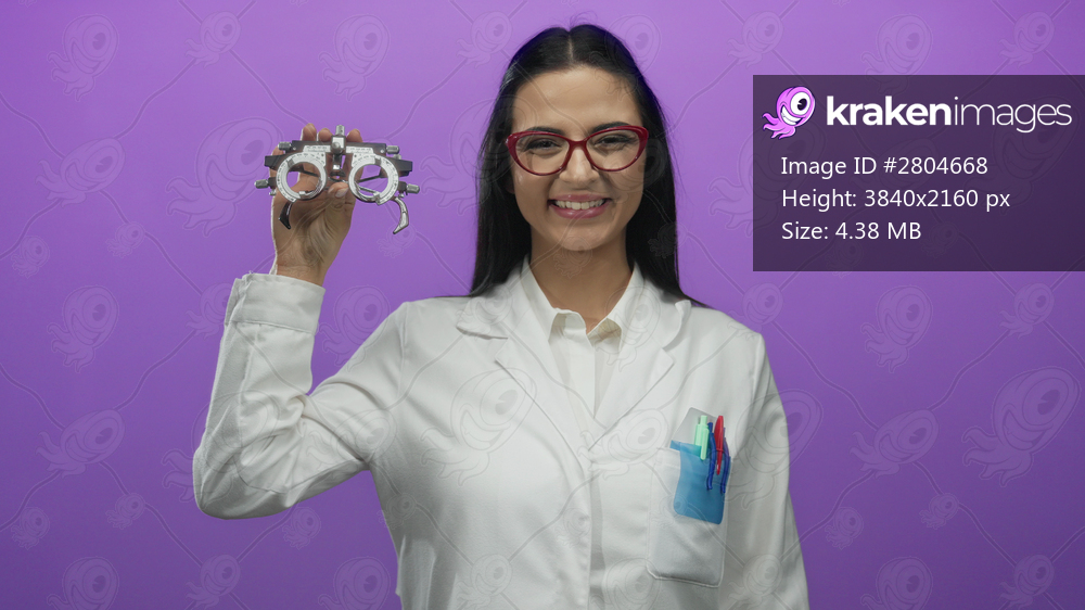 Woman optician in white uniform holding trial frame against purple background with glasses and smiling expression.