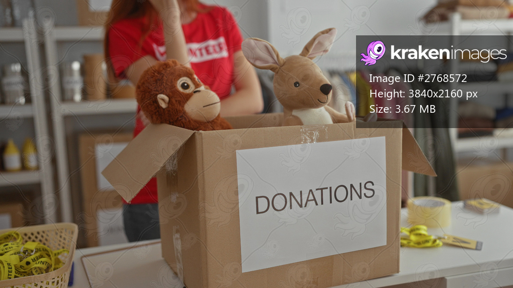 Woman organizing donations in charity room with stuffed animals in box, wearing volunteer shirt, talking on phone, surrounded by clothing and supplies in indoor setting. - Kraken Images