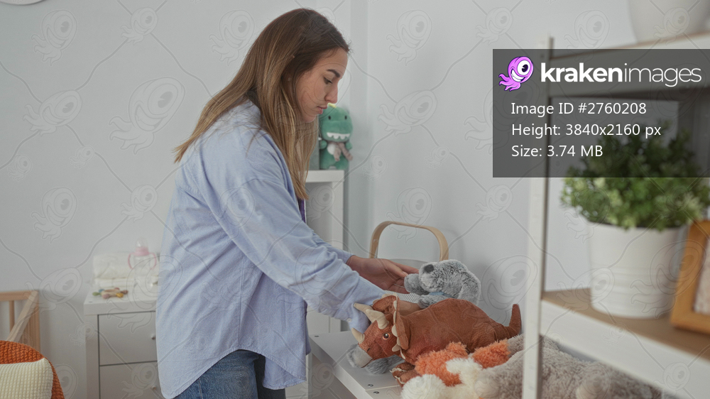 Woman organizing toys in cozy baby bedroom with framed photo and potted plant creating a nurturing atmosphere.