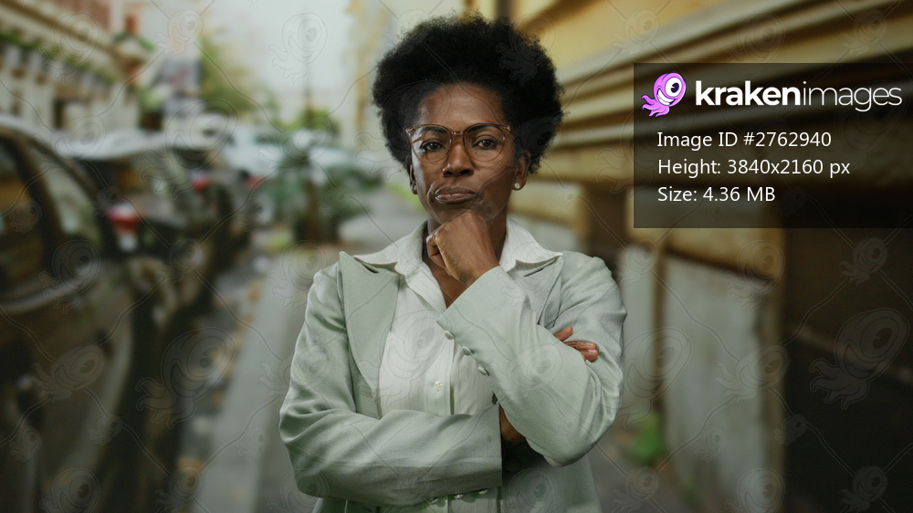 Woman outdoor street thinking urban american thoughtful afro confident standing city.