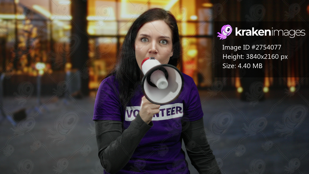 Woman outdoors brunette shouting megaphone in street wearing purple volunteer shirt conveying enthusiasm action and purpose.