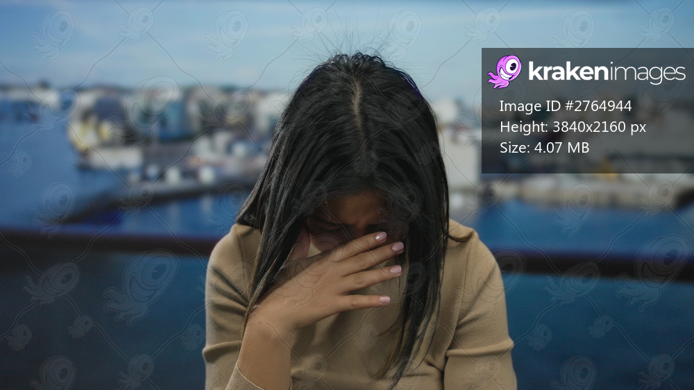 Woman outdoors by seaside at promenade appearing troubled with hands on face and blurred waterfront background suggesting thoughtful moment in scenic environment. - Kraken Images