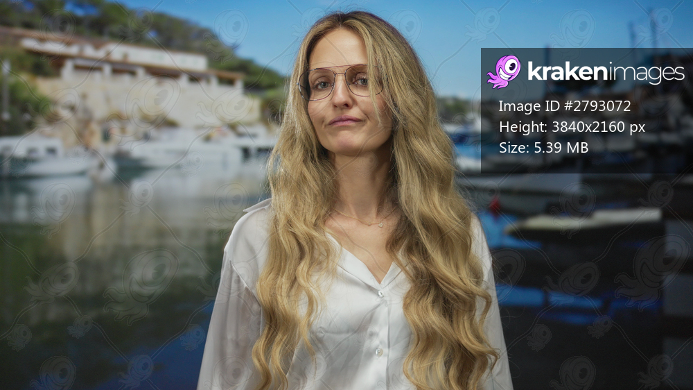 Woman outdoors by seaside with boats, expressing disapproval with thumbs down, in a scenic port setting under a clear sky, embodying dissatisfaction and reflection. - Kraken Images