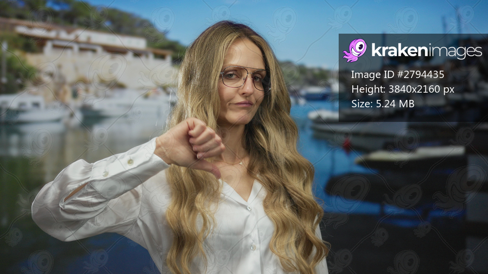 Woman outdoors by seaside with boats, expressing disapproval with thumbs down, in a scenic port setting under a clear sky, embodying dissatisfaction and reflection. - Kraken Images