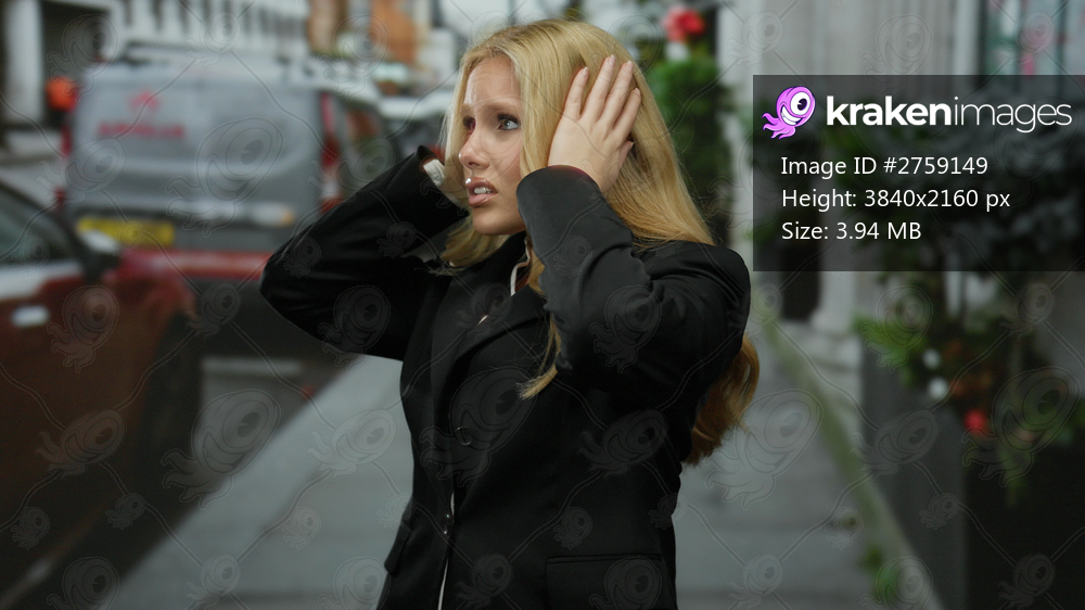 Woman outdoors covering ears in city street with vehicles and urban landscape, dressed in black suit, expressing concern, blonde hair flowing in city environment. - Kraken Images