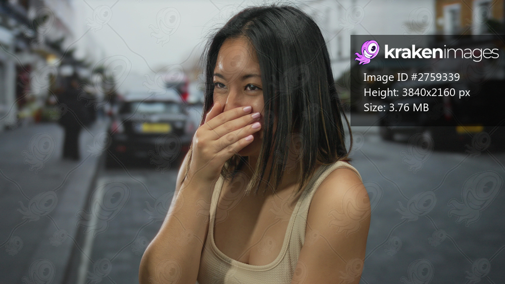 Woman outdoors covers mouth on city street with buildings and cars in background, embodying surprise and joy amidst urban scenery.