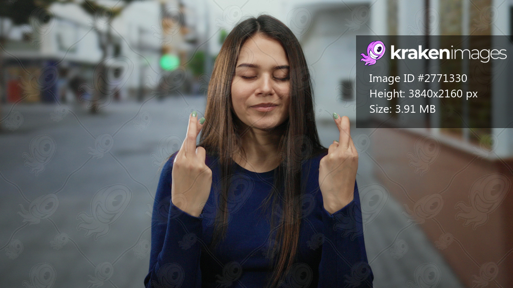 Woman outdoors crossing fingers with a hopeful expression in an urban street environment, highlighting her positive mood.