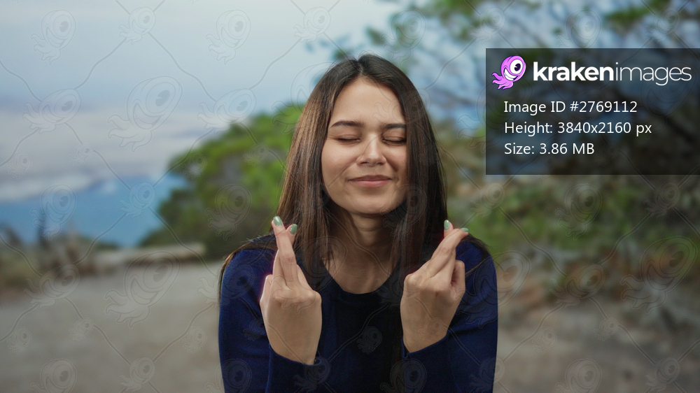 Woman outdoors crossing fingers with serene smile in park showing hope and optimism under clear sky in natural setting during peaceful day