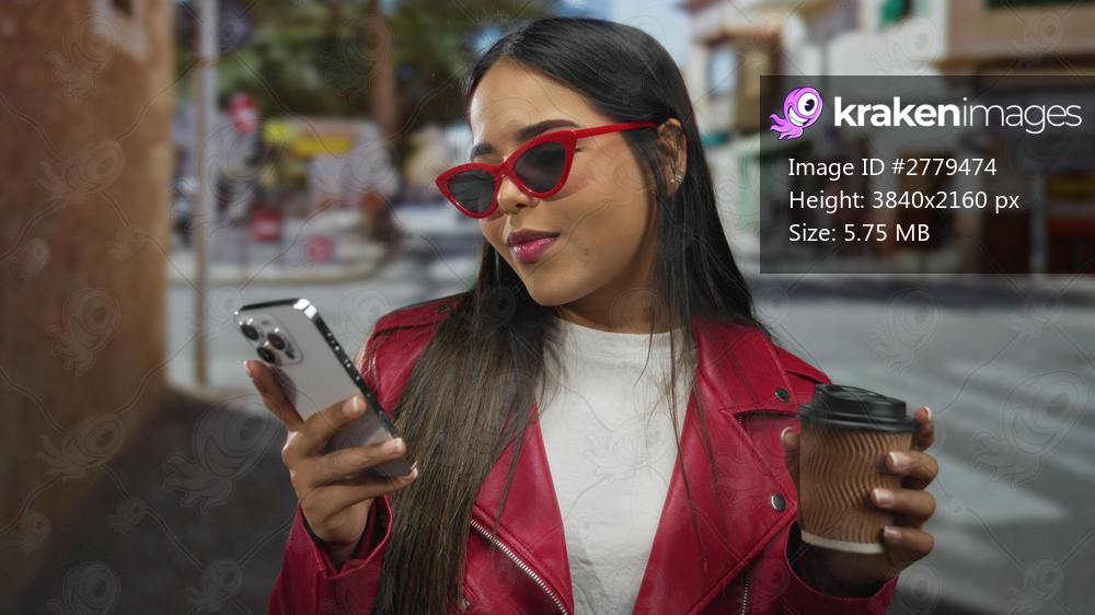 Woman outdoors drinking coffee holding smartphone wearing sunglasses and red jacket on street showing urban lifestyle.