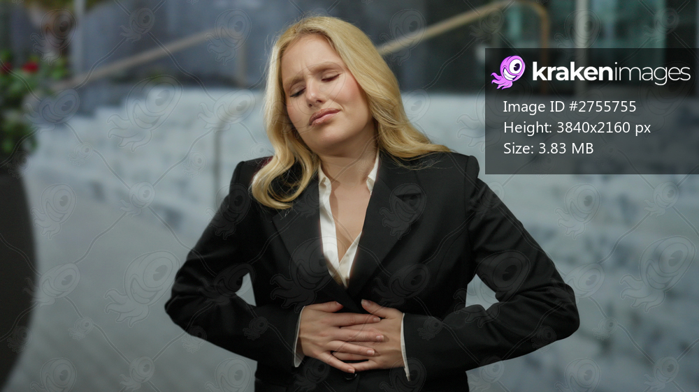 Woman outdoors feeling unwell in city street with hand on stomach, wearing black suit and blonde hair, expressing pain and discomfort in urban environment during daytime. - Kraken Images