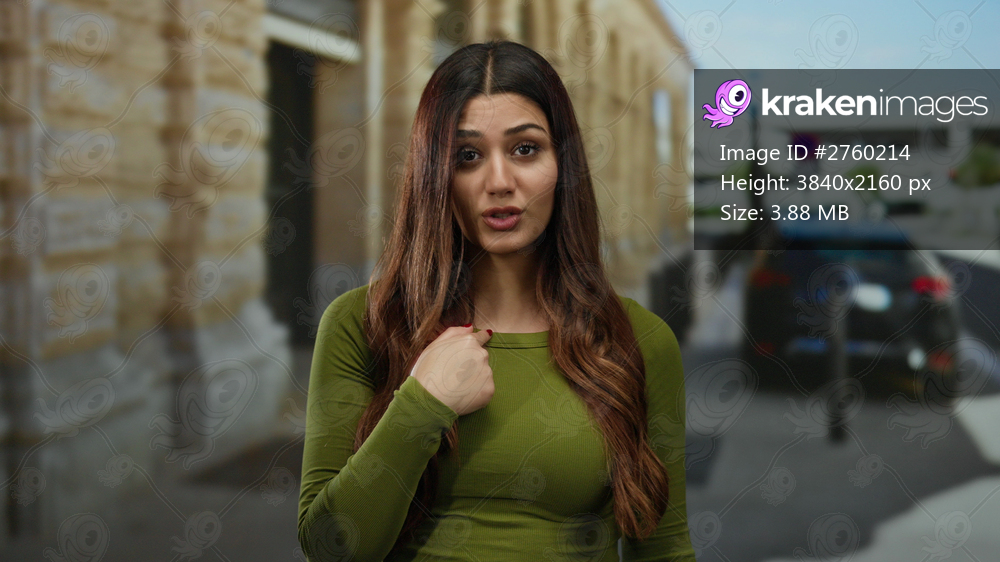Woman outdoors gestures no with finger in urban street scene, exuding calm confidence, wearing green, hispanic descent, showcasing casual fashion against blurred city background. - Kraken Images