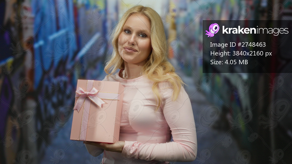 Woman outdoors holding pink gift box in urban street setting with graffiti backdrop wearing pink outfit smiling with long blonde hair in vibrant lively city atmosphere - Kraken Images