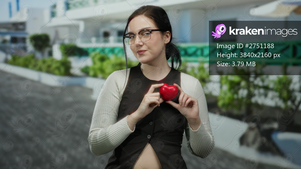 Woman outdoors holding red heart on a sunny street with plants in background exudes love and positivity with casual style and brunette hair.