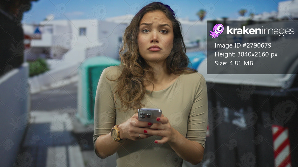 Woman outdoors holding smartphone on a street near recycling containers looking concerned, reflecting environmental awareness and urban lifestyle.