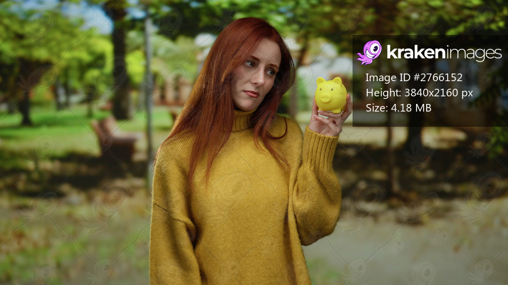 Woman outdoors holding yellow piggy bank in a serene park, dressed in a cozy sweater, expressing thoughtfulness under green trees and surrounded by sunlight. - Kraken Images