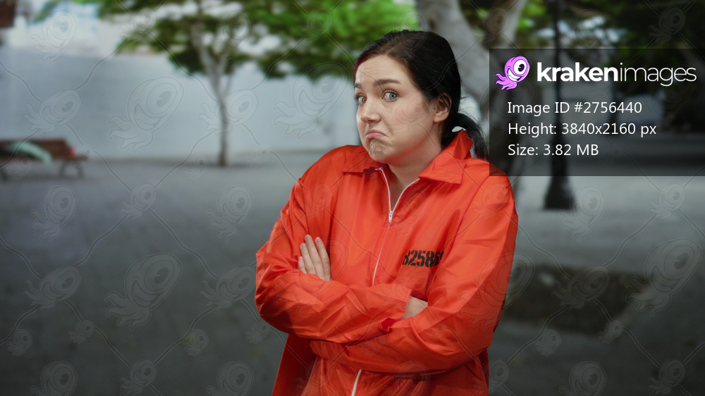 Woman outdoors in a bright orange prison jumpsuit on a street with trees looking thoughtful.