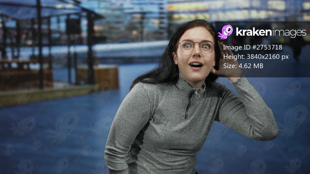Woman outdoors in a city street gestures listening and thumbs up, expressing engagement and communication in an urban environment.