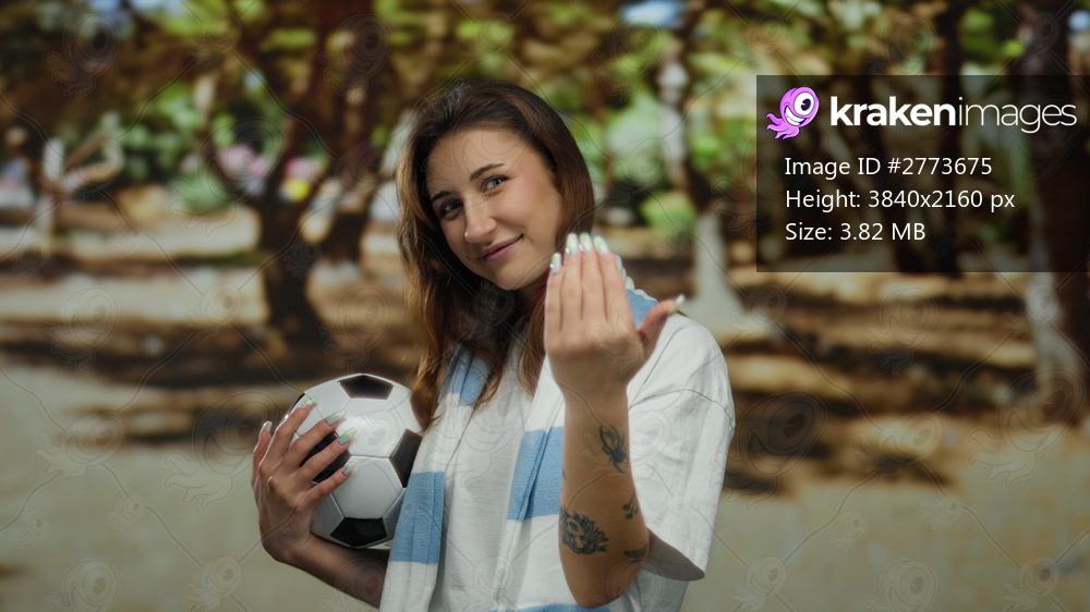 Woman outdoors in a park holding a soccer ball with blue scarf making inviting gesture with a hand and smiling warmly, surrounded by blurred trees in the background. - Kraken Images