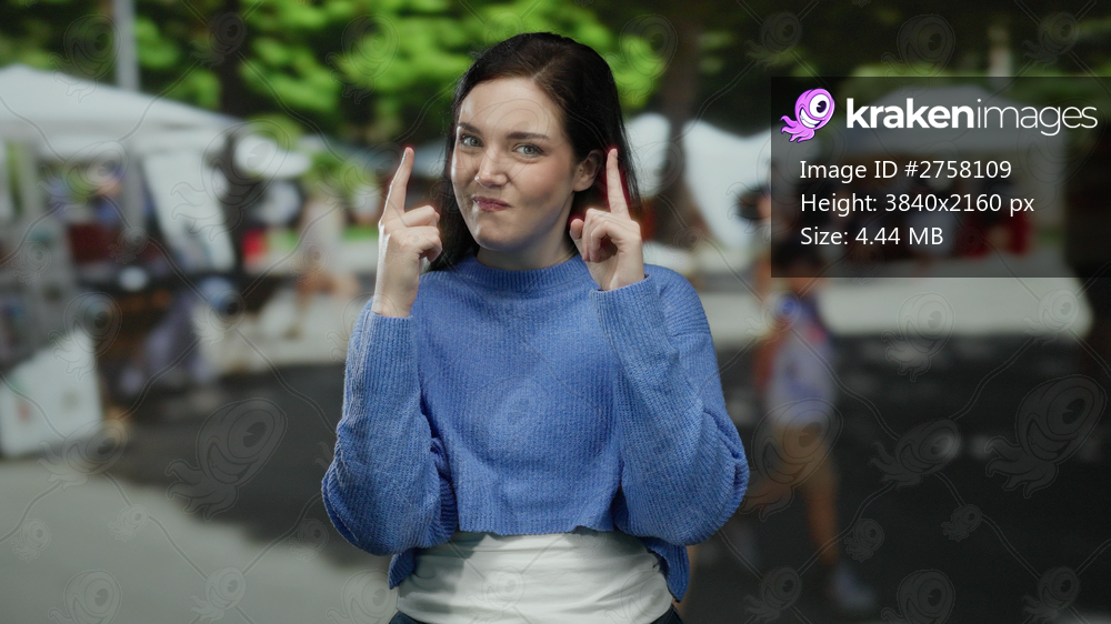 Woman outdoors in blue sweater points upward on a sunny day with market stalls in the background, expressing curiosity and focus in a vibrant street scene. - Kraken Images