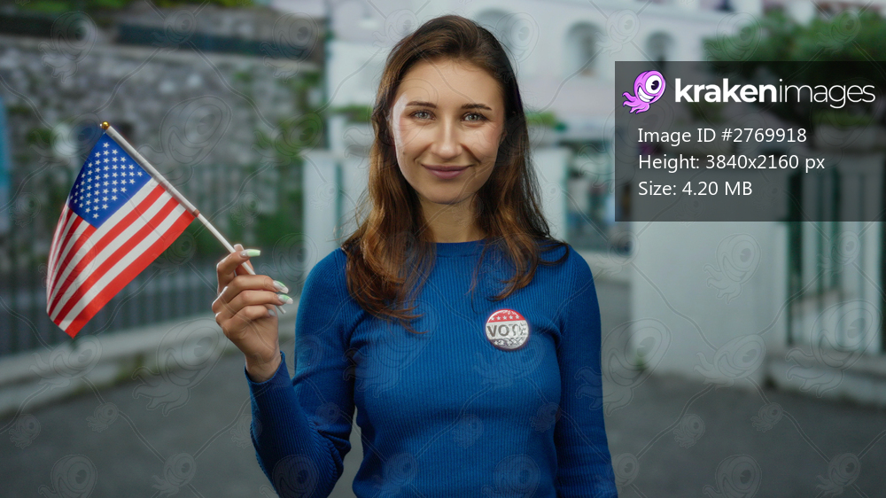 Woman outdoors in city holding american flag and vote badge on blue sweater, symbolizing civic engagement and pride in the united states.