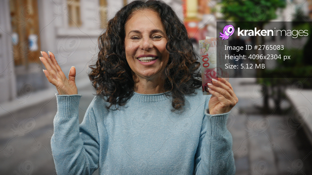 Woman outdoors in city street combing hair with smile and holding new zealand dollars, vibrant cityscape in background, enjoying urban scene